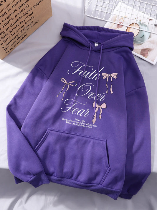 Pink Bow Faith Over Fear Printing Hoodies Women Winter Fleece Warm Hooded Fashion Pocket Tops Comfortable Loose Woman Clothes