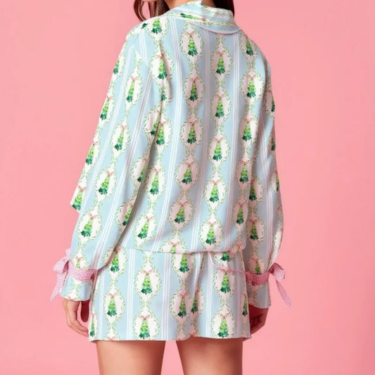 women's Pajama Set Blue Floral Tree Print 2 Piece Lapel V Neck Long Sleeve Top Pants Silk Satin Lounge Sleepwear