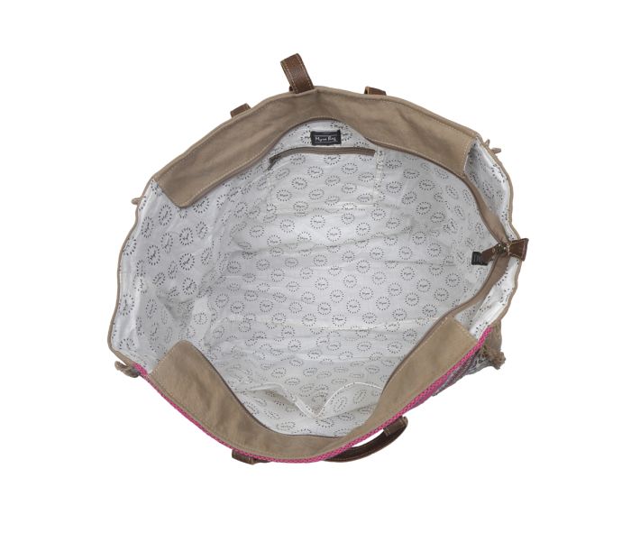 This vibrant weekender bag has a boho artsy look with detailed patterns. The roomy interior has space for all your essentials and features a zippered pocket and zipper-close top. The back also has an extra zippered pocket.