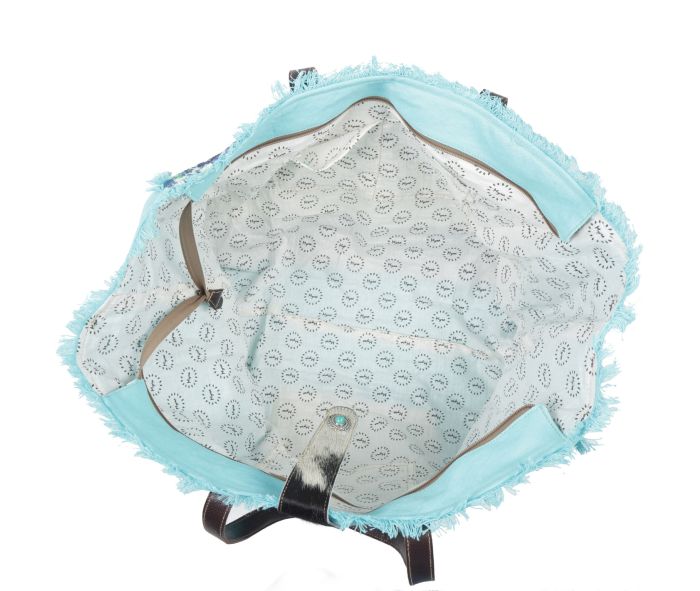 An eclectic and electric design closely resembling manadala art, this handbag carries the most delightful hues of blue and intricacies of art