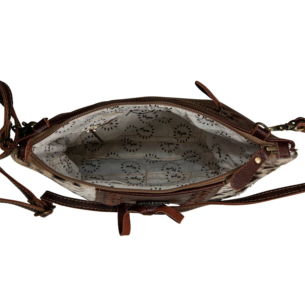 This exceptional bag features incredible design anchored in the beautiful hair-on hide and front panel of chocolate leather. Special stitching and tassle accents complete the look. The back is gorgeous chocolate leather with separate zippered pocket. Zipper-close top. Matching leather wristlet carrying strap and shoulder strap.