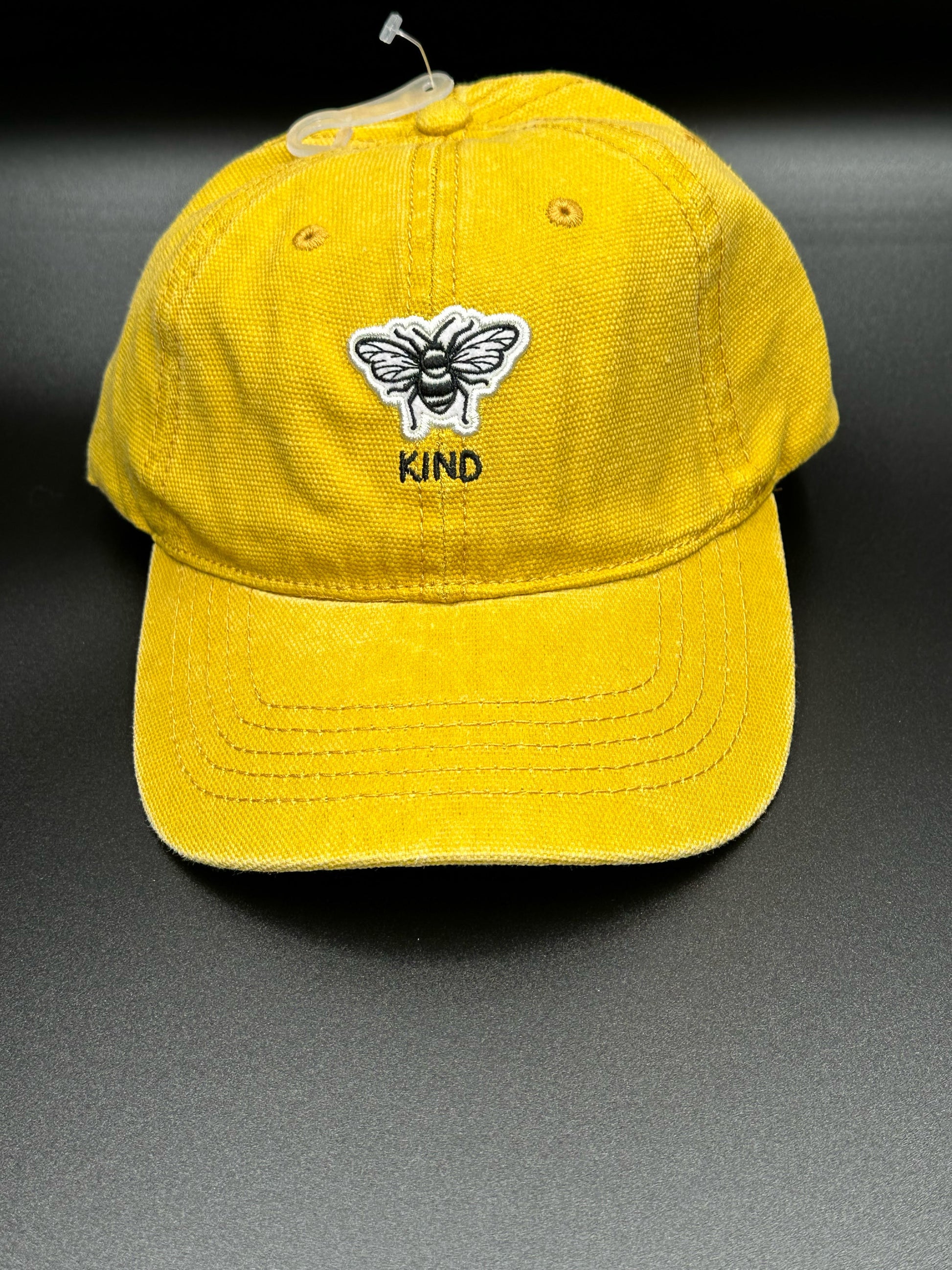 Women's Autumn Gold Embroidered Bee Kind Washed Cotton Twill Baseball Hat, curved bill. Perfect for that casual "messy hair - don't care" day!