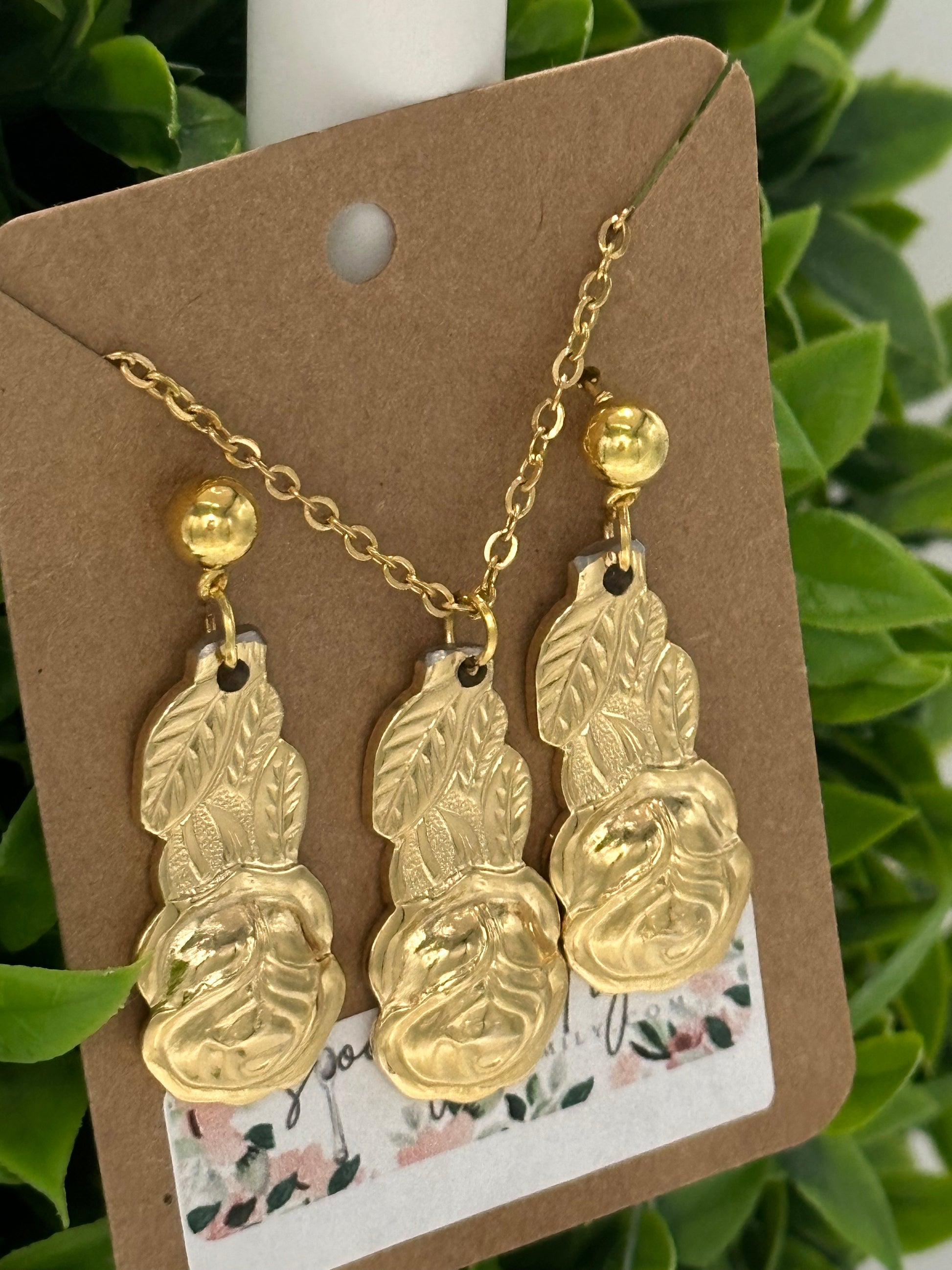 Gorgeous necklace and earrings made from vintage, recycled silverware. This particular set is made from the very rare Gold Rose silverware set. Each set is unique. Earring backs are stainless steel.
