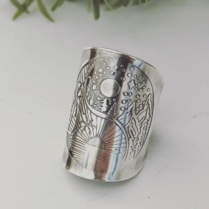 This ring is made from a vintage, flattened spoon bowl. The beautiful design has been engraved onto the ring.