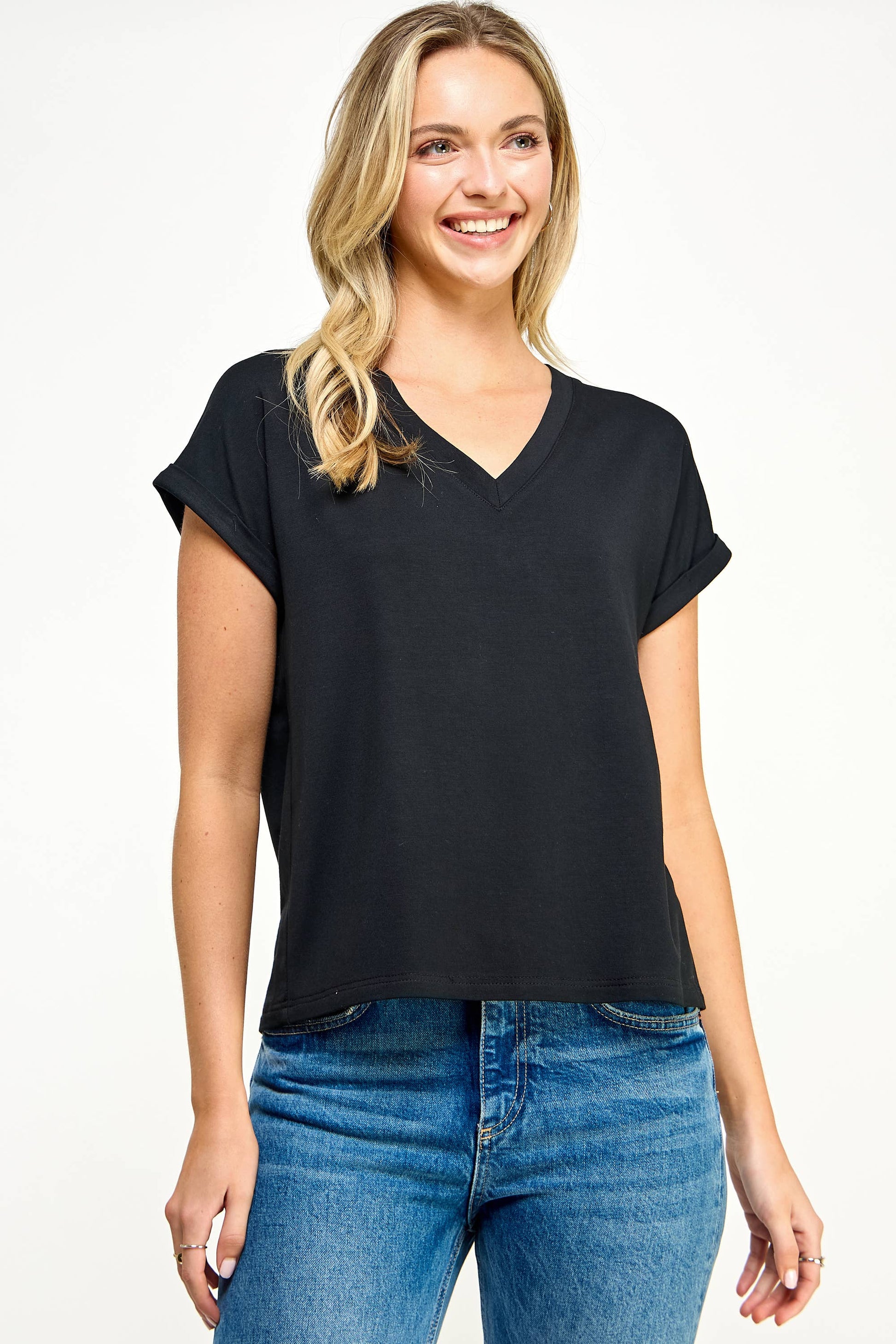 Kim Notes: You guys, this tee is gorgeous! A high-quality drapey fabric of rayon and spandex gives it a super polished look. You're going to reach for this one every time! Check out a separate listing for the same tee in cream.